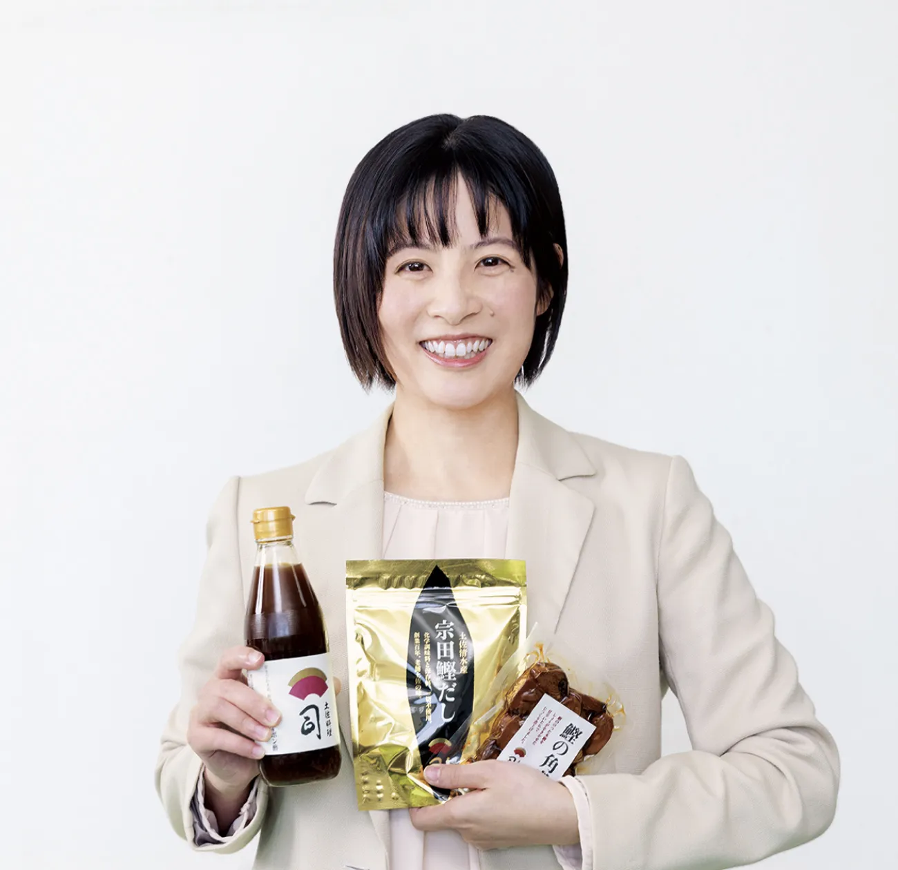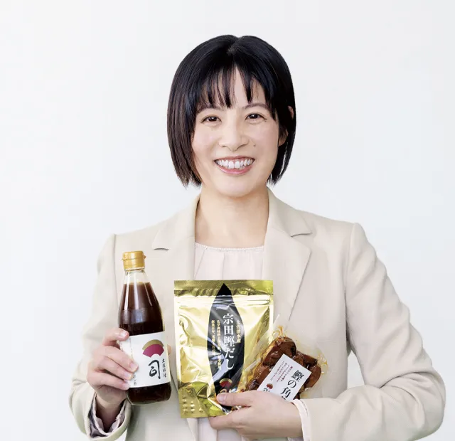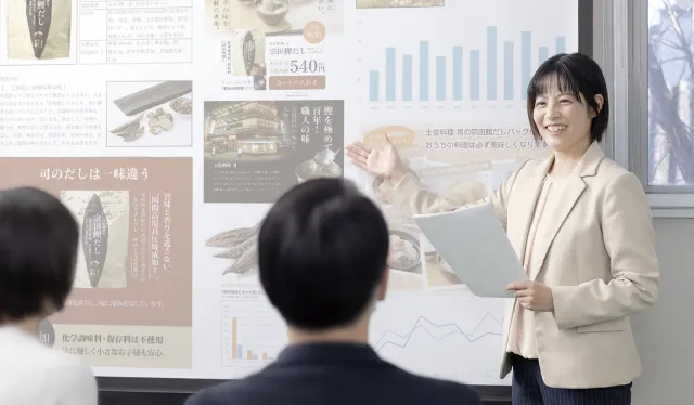 司高知本店で接客を担当していましたが、結婚、出産を機に食品事業部へ新しいステップを踏み出しました。店舗ではたくさんのお客様から「美味しかったよ」という声をいただけることが多く、通販商品でも、お店の味をそのままご家庭でもお召し上がりいただけるような商品の開発を、日々目指しています。接客の経験があったからこそ、お客様が求めているものが浮かび、商品化に繋がっています。